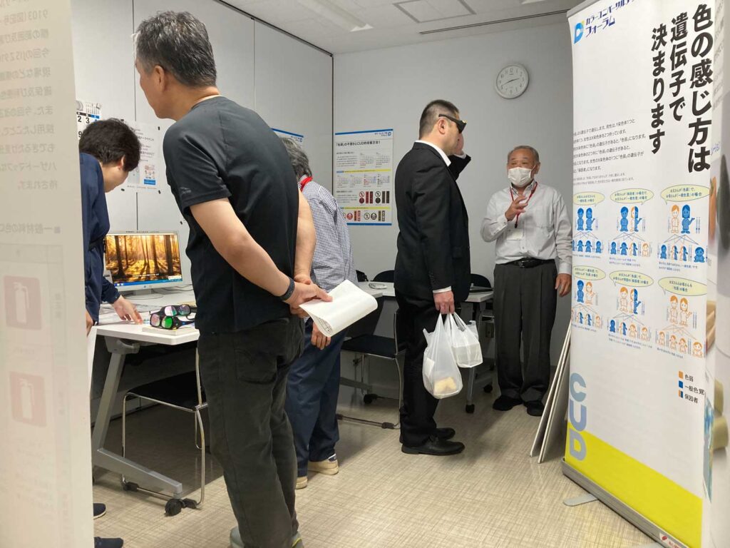 色々改善されたCUD事例や、見分け難い色の食い合わせ事例などをパネルにして見ていただきました。バリアントール(色弱疑似体験メガネ)を掛けてパネルを見ながら説明を受けている方(中央レジ袋を持っている人)は吉野川市長です。